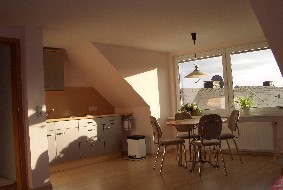Unsere zweite Ferienwohung befindet sich im Dachgeschoss und überzeugt durch ihren besonderen Charme. Lichtdurchflutet verfügt sie über ein Schlafzimmer, einen großen Aufenthaltsraum mit TV und Küchenzeile sowie ein Duschbad. Die Gesamtgröße beträgt etwa 43 qm.